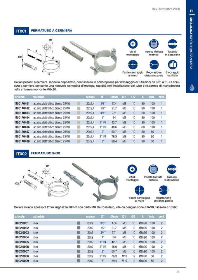 Collari pesanti a cerniera, modello depositato, con tassello in polipropilene per il fissaggio di tubazioni da 3/8" a 3". La chiu-