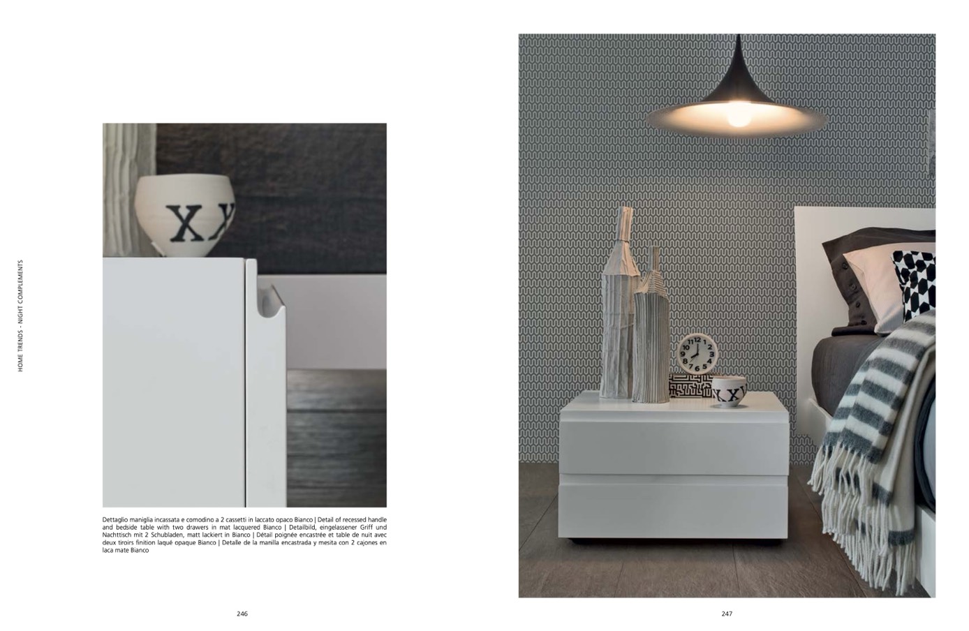 Dettaglio maniglia incassata e comodino a 2 cassetti in laccato opaco Bianco | Detail of recessed handle
