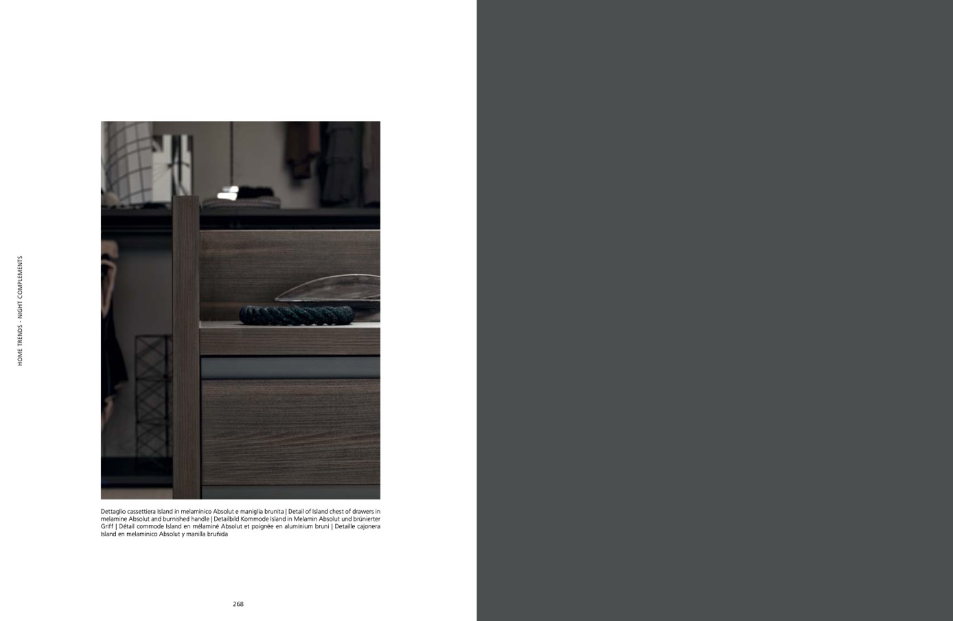 Dettaglio cassettiera Island in melaminico Absolut e maniglia brunita | Detail of Island chest of drawers in