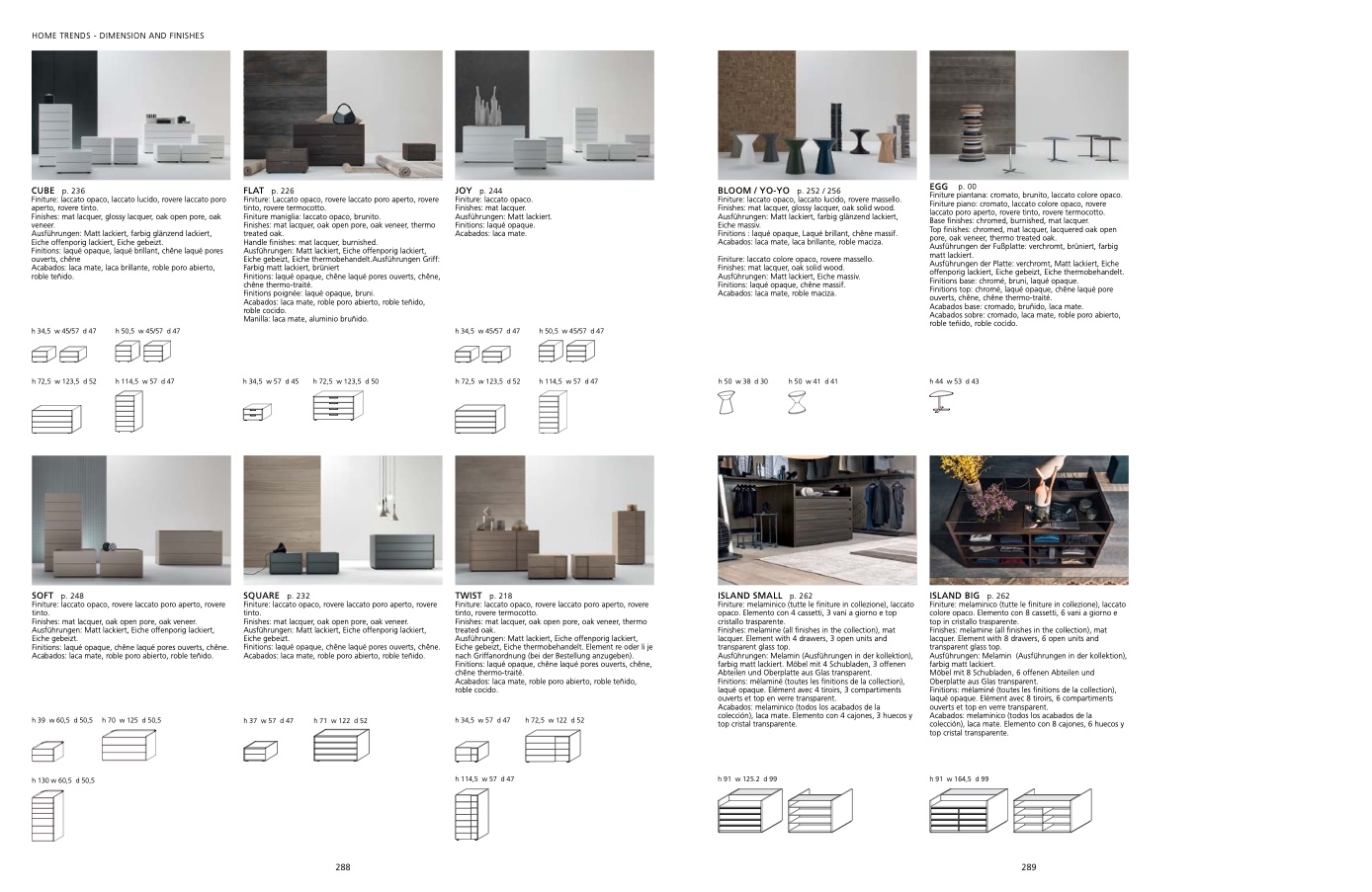Finishes: mat lacquer, glossy lacquer, oak open pore, oak