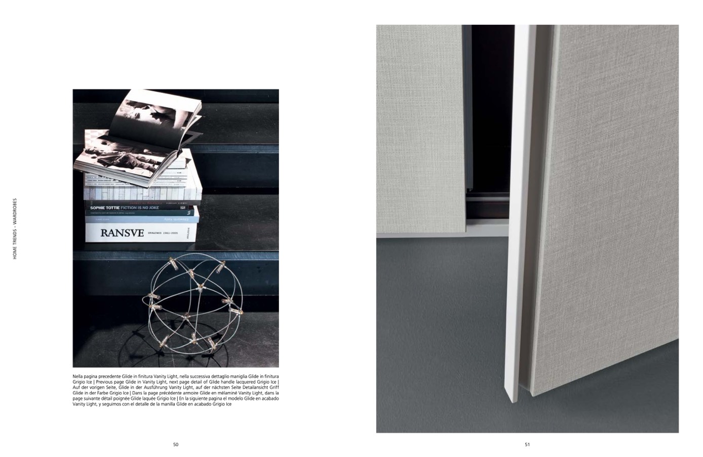 Nella pagina precedente Glide in finitura Vanity Light, nella successiva dettaglio maniglia Glide in finitura