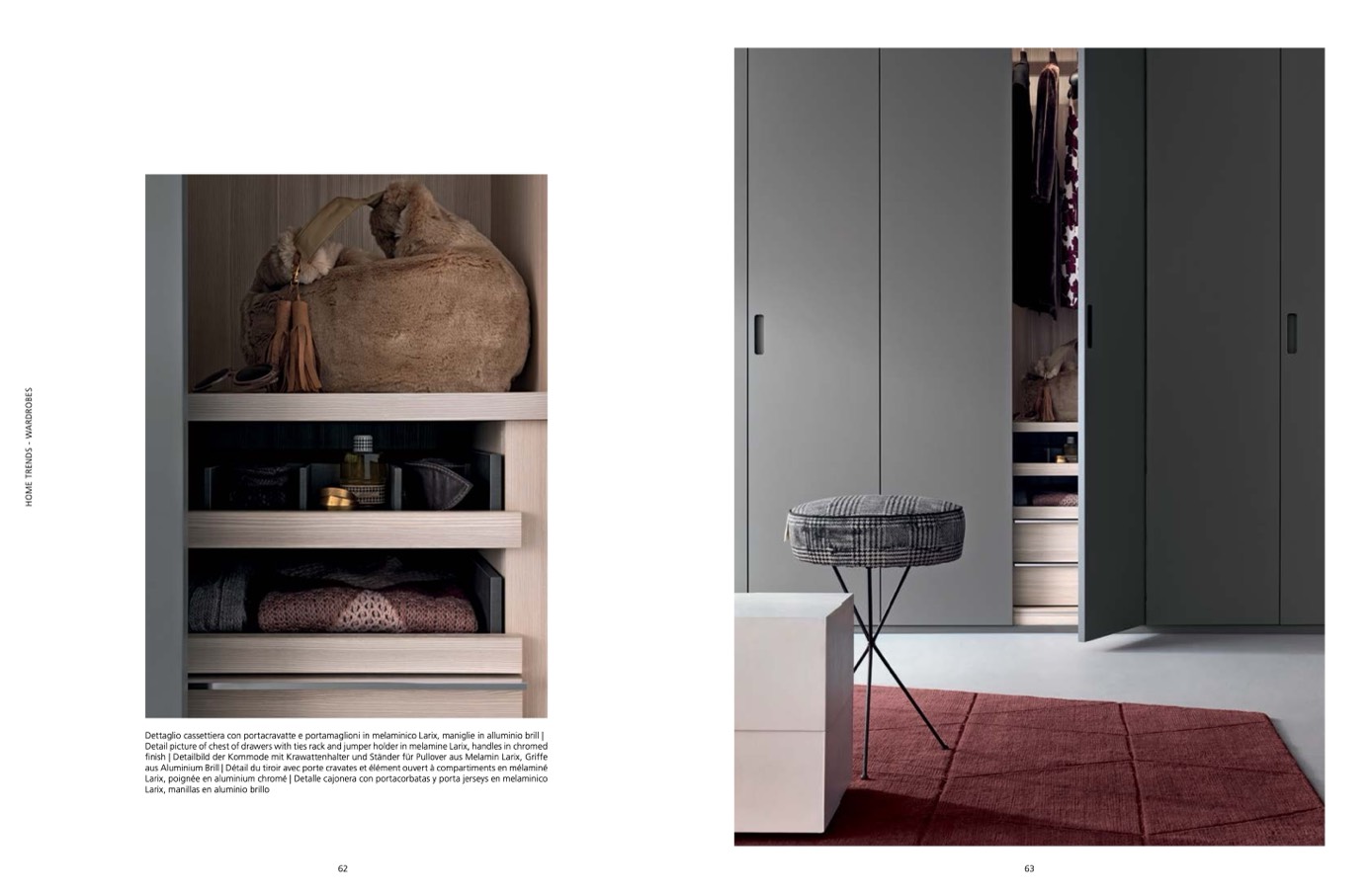 Dettaglio cassettiera con portacravatte e portamaglioni in melaminico Larix, maniglie in alluminio brill |
