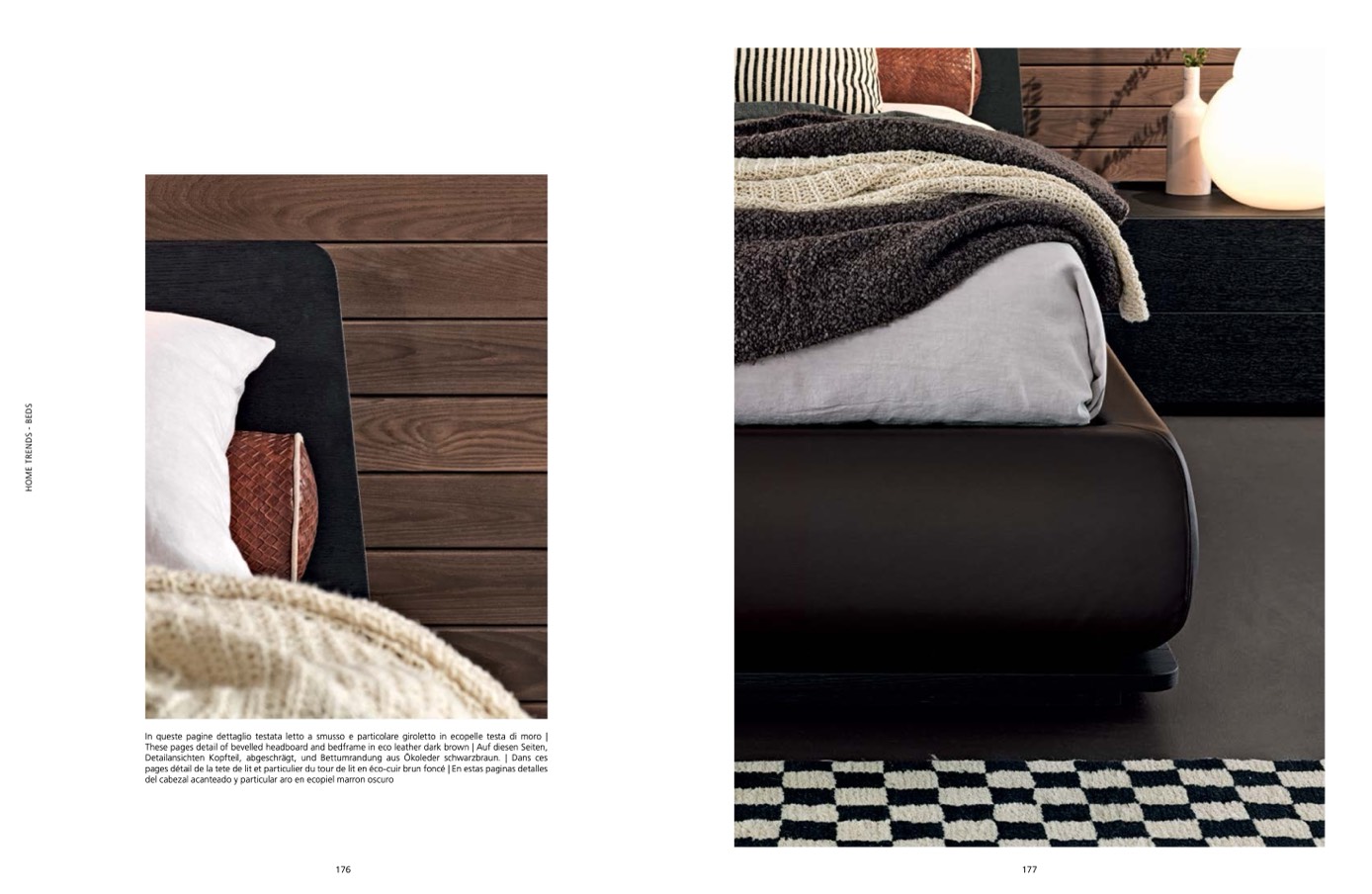 These pages detail of bevelled headboard and bedframe in eco leather dark brown | Auf diesen Seiten,