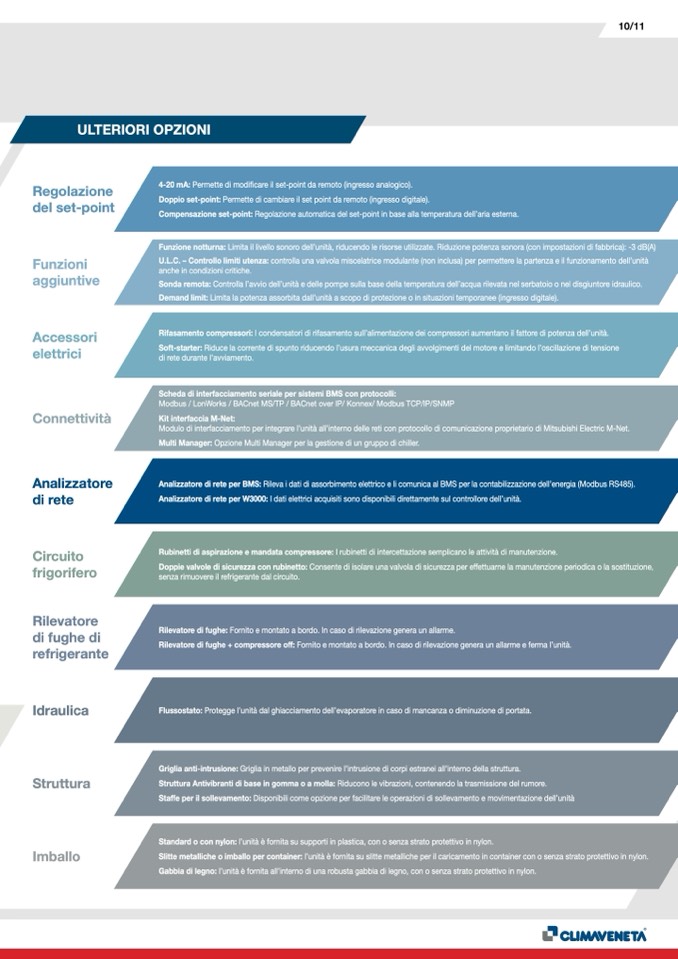 Rilevatore di fughe + compressore off: Fornito e montato a bordo. In caso di rilevazione genera un allarme e ferma l’unità.