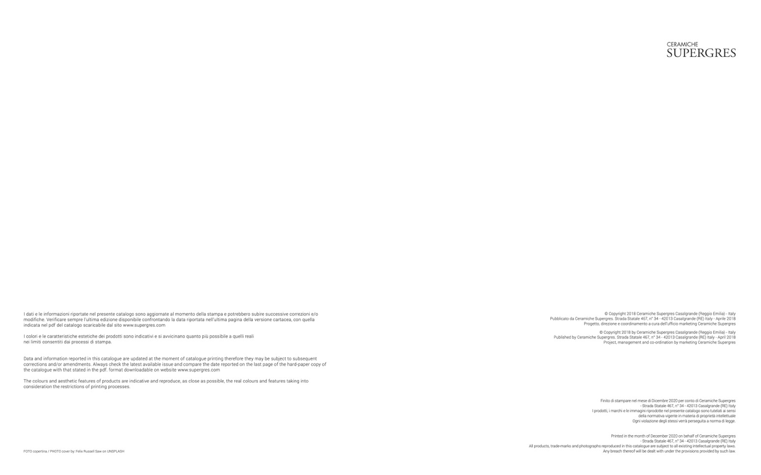 Finito di stampare nel mese di Dicembre 2020 per conto di Ceramiche Supergres