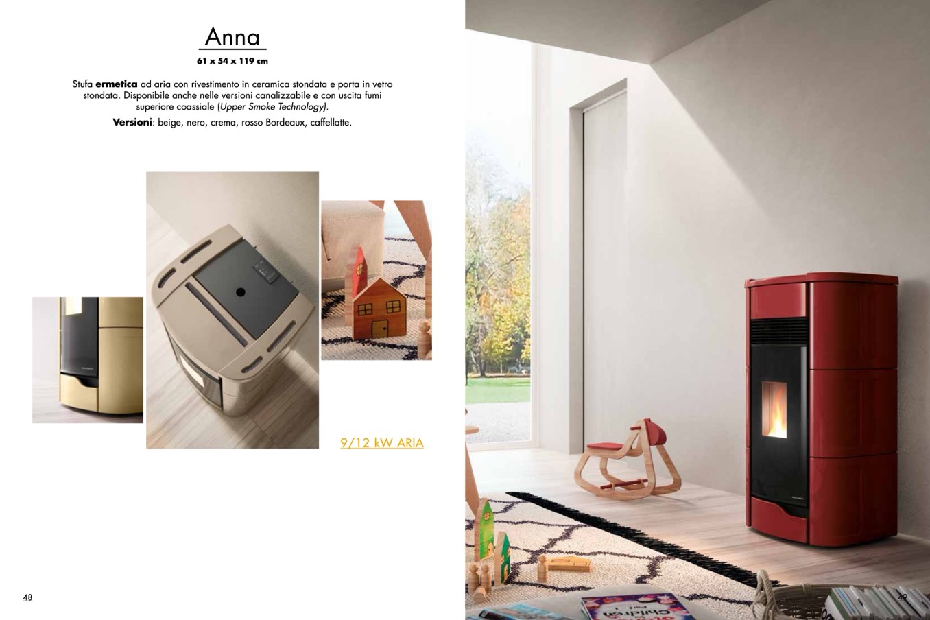 Stufa ermetica ad aria con rivestimento in ceramica stondata e porta in vetro