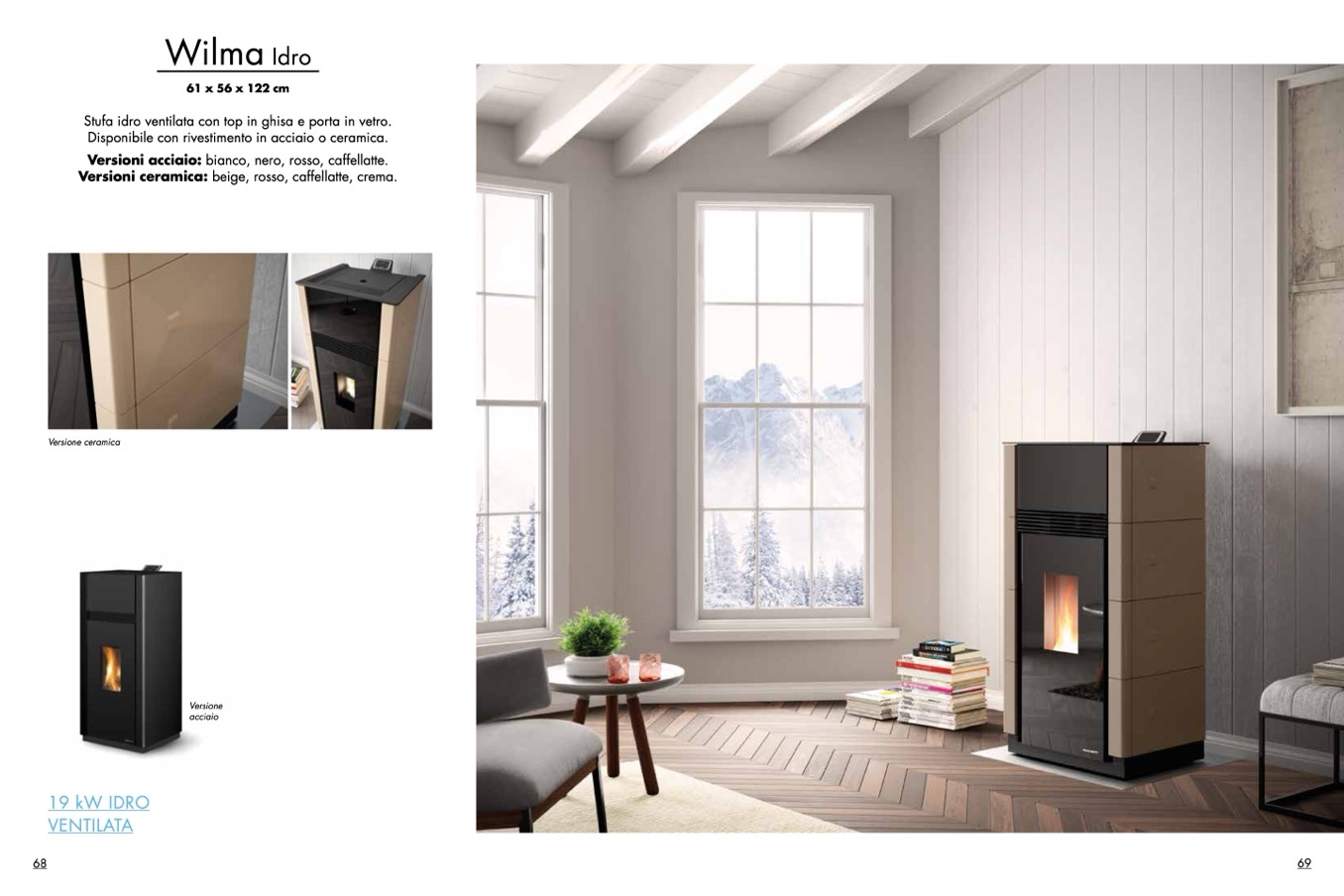 Stufa idro ventilata con top in ghisa e porta in vetro.