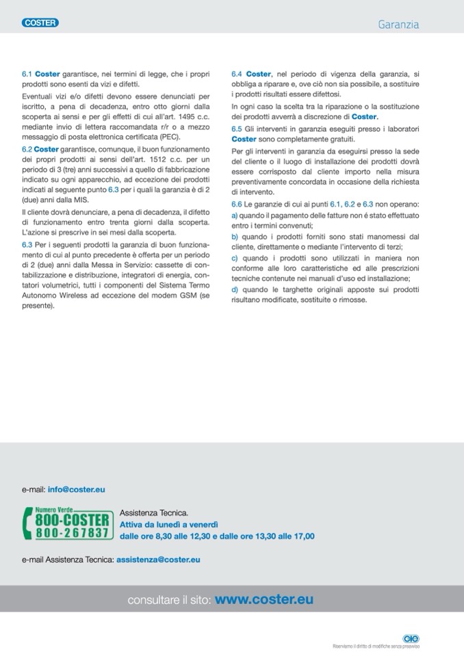 6.2 Coster garantisce, comunque, il buon funzionamento
