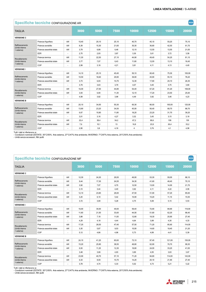 - Condizioni nominali (ESTATE: 35°C/50% Aria esterna, 27°C/47% Aria ambiente; INVERNO: 7°C/87% Aria esterna, 20°C/50% Aria ambiente)