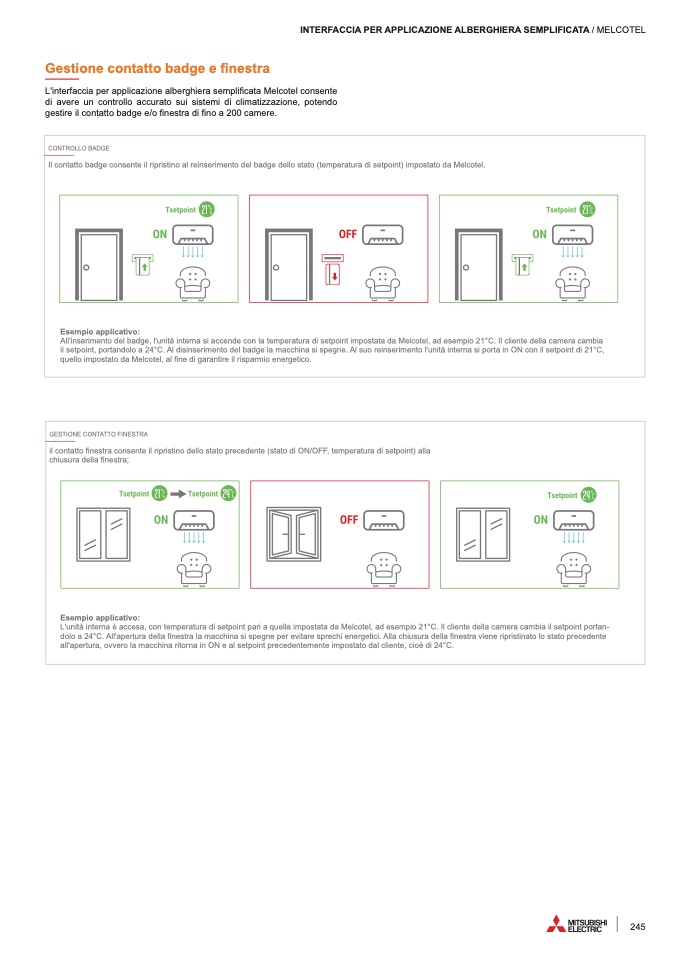 All'inserimento del badge, l'unità interna si accende con la temperatura di setpoint impostata da Melcotel, ad esempio 21°C. Il cliente della camera cambia