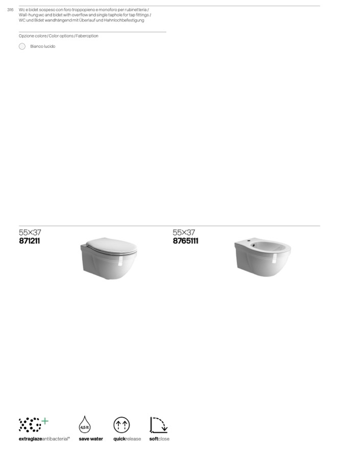 316 Wc e bidet sospeso con foro troppopieno e monoforo per rubinetteria /