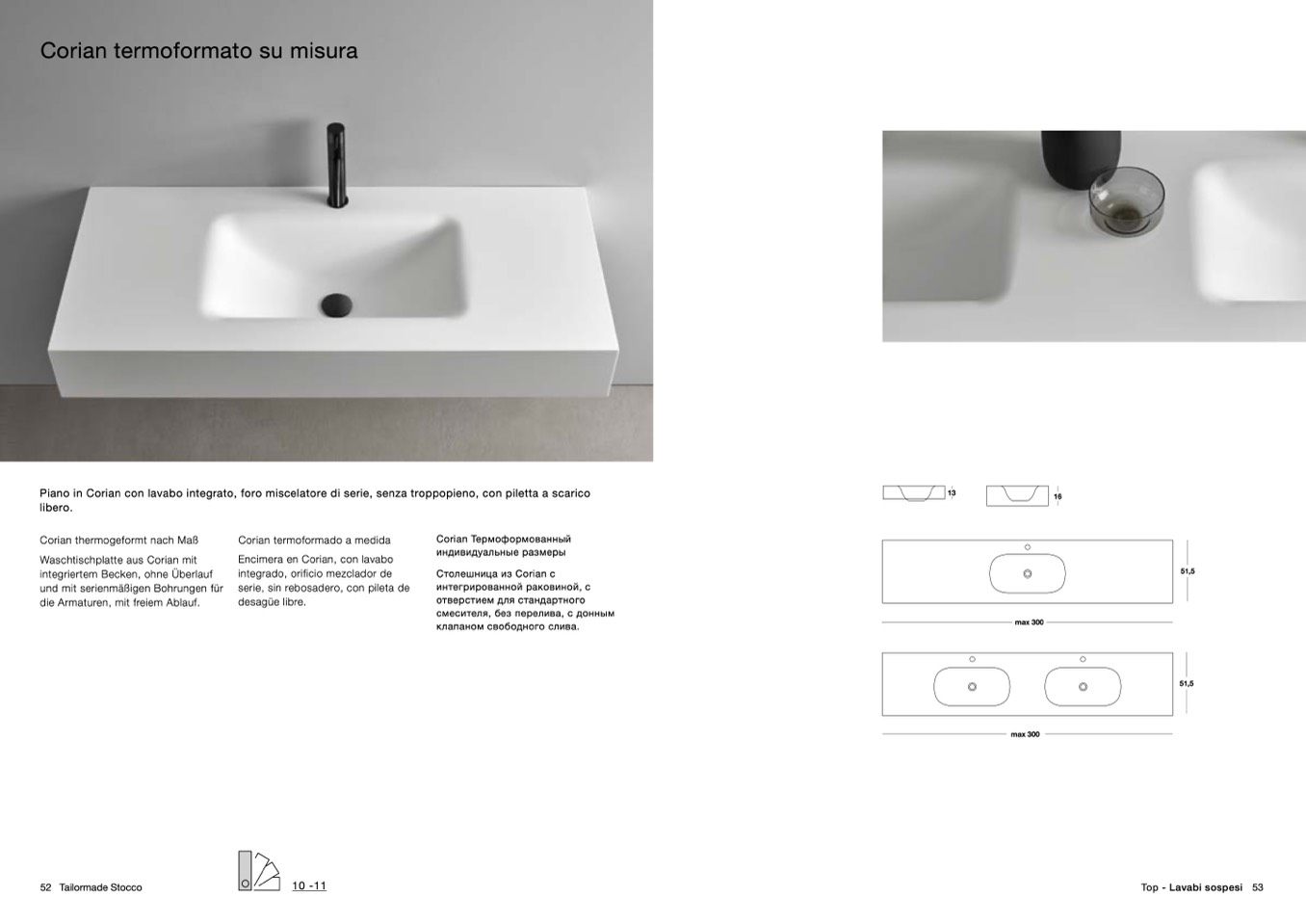 Piano in Corian con lavabo integrato, foro miscelatore di serie, senza troppopieno, con piletta a scarico