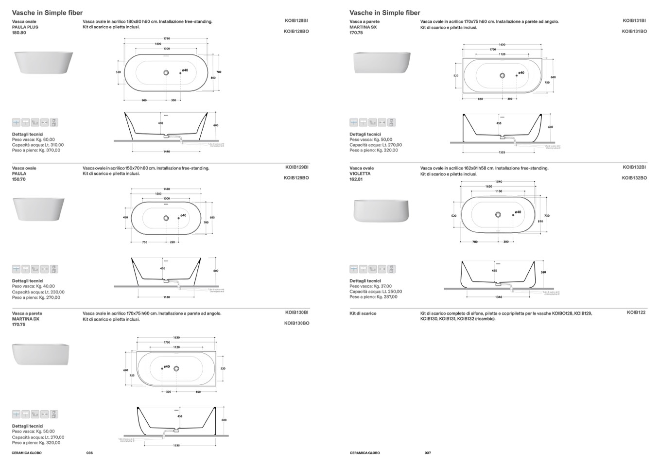 Kit di scarico completo di sifone, piletta e copripiletta per le vasche KOIBO128, KOIB129,