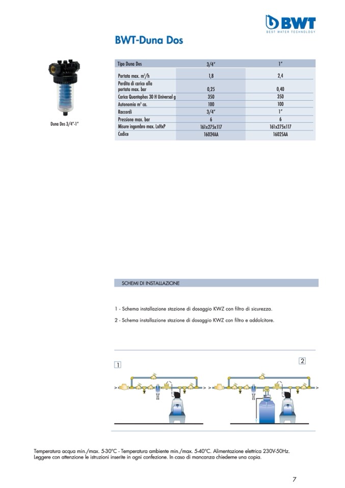 Temperatura acqua min./max. 5-30°C - Temperatura ambiente min./max. 5-40°C. Alimentazione elettrica 230V-50Hz.