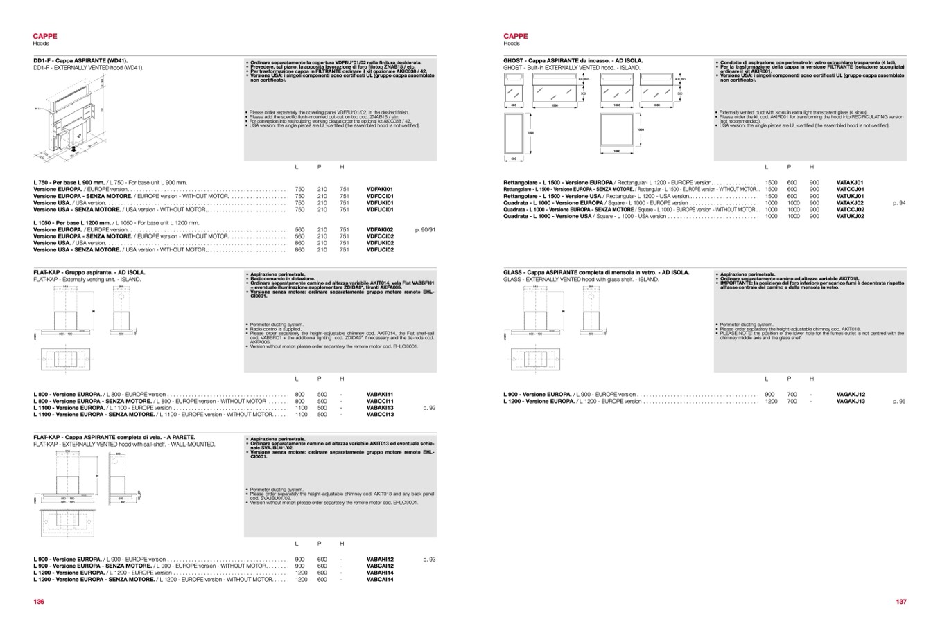 • Versione USA: i singoli componenti sono certificati UL (gruppo cappa assemblato