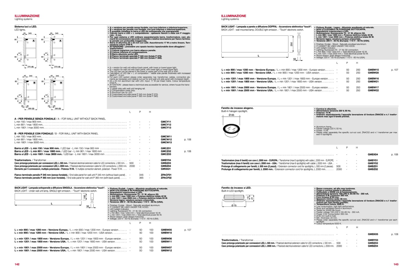 • B = version for wall unit with back panel, with lower light or lower/upper light.