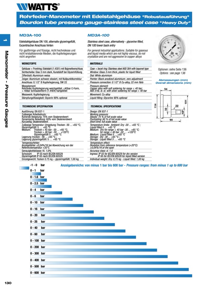 Anzeigebereiche: von minus 1 bar bis 600 bar - Pressure ranges: from minus 1 up to 600 bar