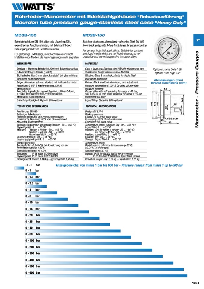 Anzeigebereiche: von minus 1 bar bis 600 bar - Pressure ranges: from minus 1 up to 600 bar