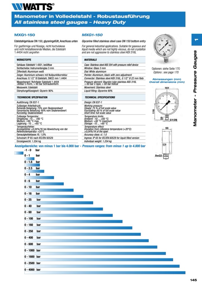 Anzeigebereiche: von minus 1 bar bis 4.000 bar - Pressure ranges: from minus 1 up to 4.000 bar