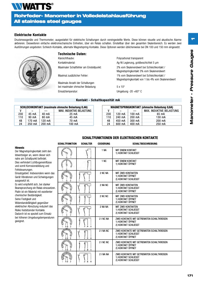 Druckmessgeräte und Thermometer, ausgestattet für elektrische Schaltungen durch voreingestellte Werte. Diese können visuelle und akustische Alarme
