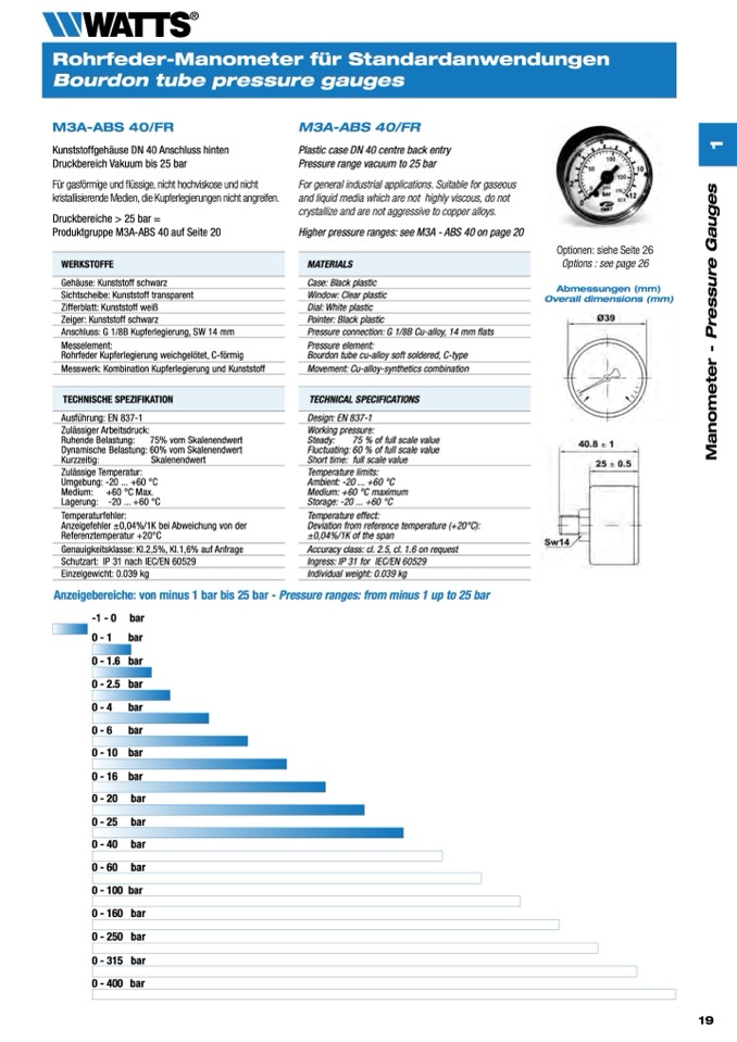 Anzeigebereiche: von minus 1 bar bis 25 bar - Pressure ranges: from minus 1 up to 25 bar