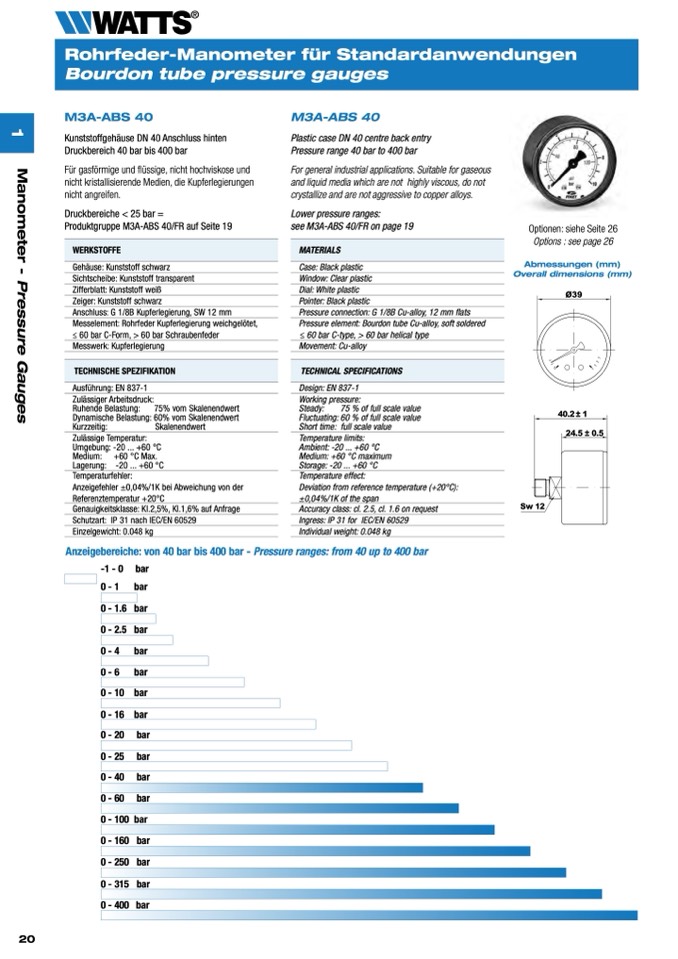 Anzeigebereiche: von 40 bar bis 400 bar - Pressure ranges: from 40 up to 400 bar