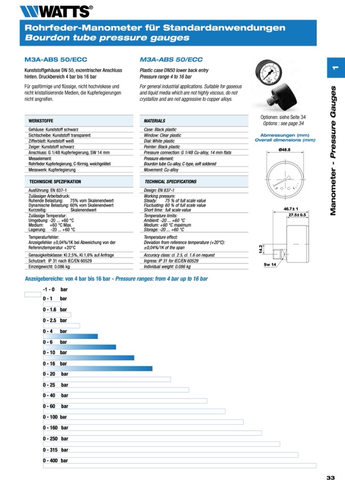 Anzeigebereiche: von 4 bar bis 16 bar - Pressure ranges: from 4 bar up to 16 bar