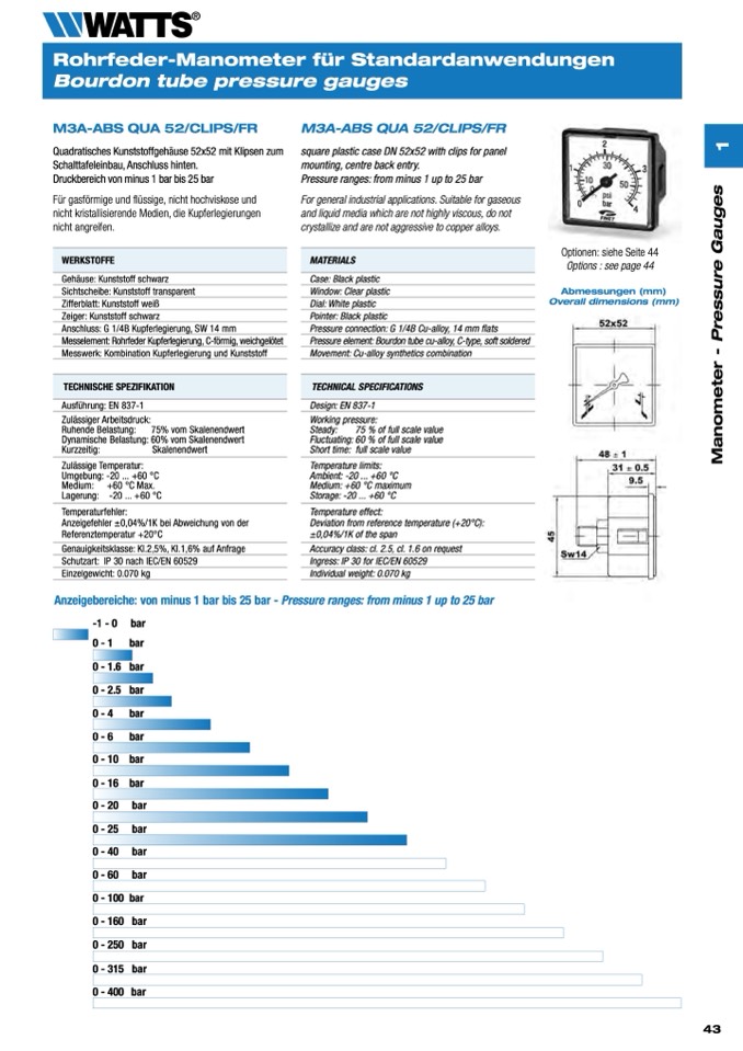 Anzeigebereiche: von minus 1 bar bis 25 bar - Pressure ranges: from minus 1 up to 25 bar