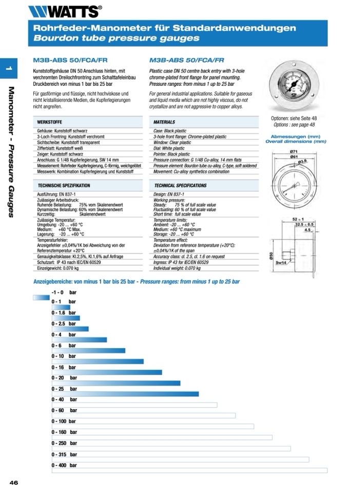 Anzeigebereiche: von minus 1 bar bis 25 bar - Pressure ranges: from minus 1 up to 25 bar
