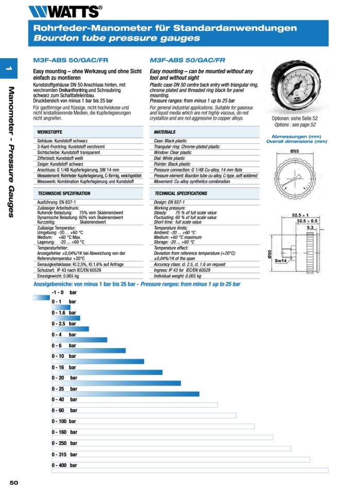 Anzeigebereiche: von minus 1 bar bis 25 bar - Pressure ranges: from minus 1 up to 25 bar