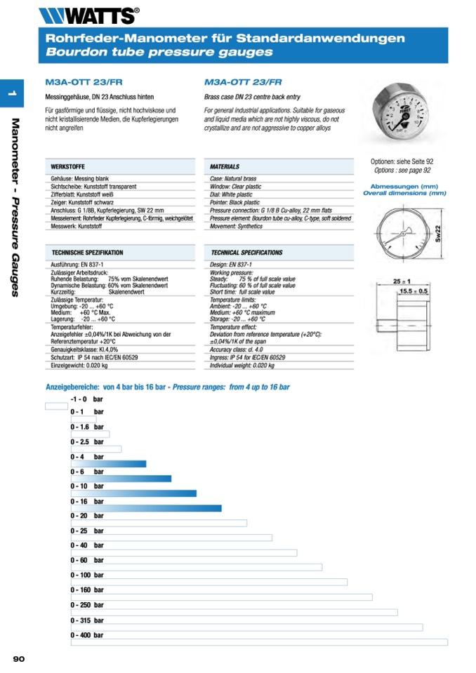 Anzeigebereiche: von 4 bar bis 16 bar - Pressure ranges: from 4 up to 16 bar