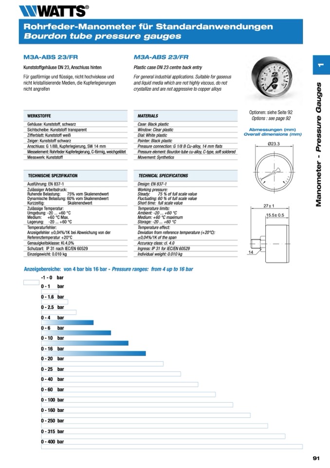Anzeigebereiche: von 4 bar bis 16 bar - Pressure ranges: from 4 up to 16 bar