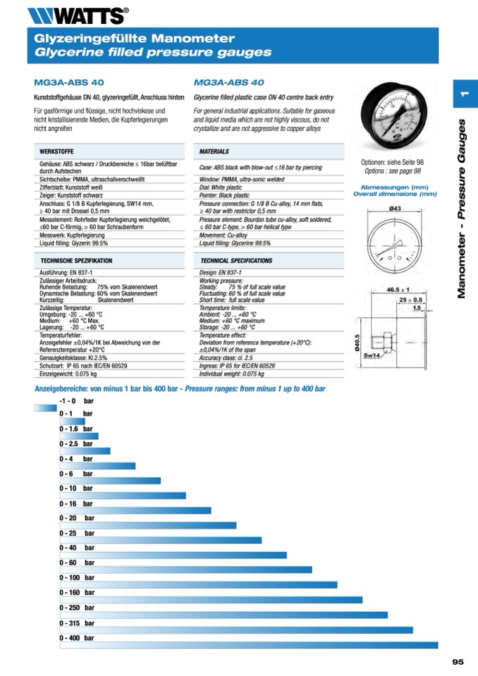 Anzeigebereiche: von minus 1 bar bis 400 bar - Pressure ranges: from minus 1 up to 400 bar
