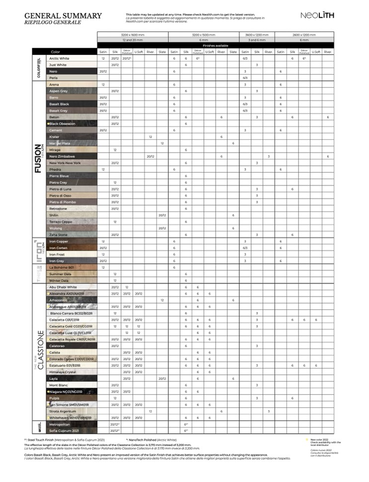 This table may be updated at any time. Please check Neolith.com to get the latest version.