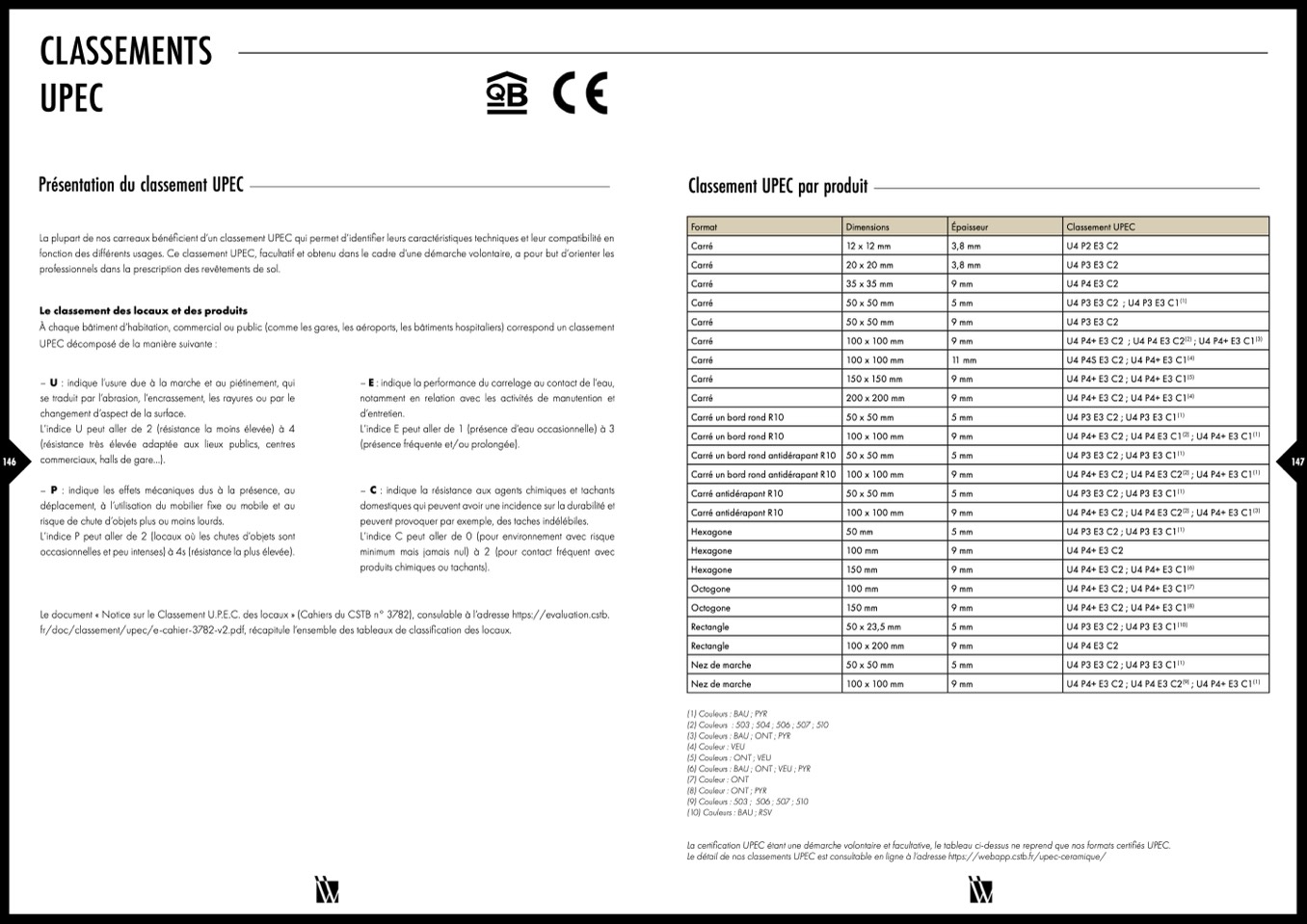 La plupart de nos carreaux bénéficient d’un classement UPEC qui permet d’identifier leurs caractéristiques techniques et leur compatibilité en