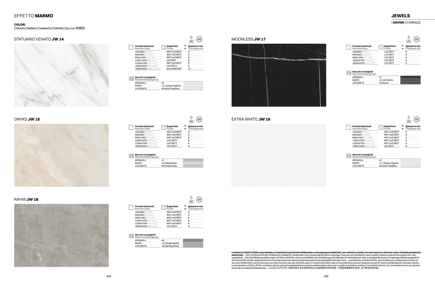 Le finiture LUCIDA e PEARL sono limitate a rivestimenti e pavimenti residenziali o comunque poco sollecitati, non a diretto contatto con aree esterne e dove non siano richieste prestazioni