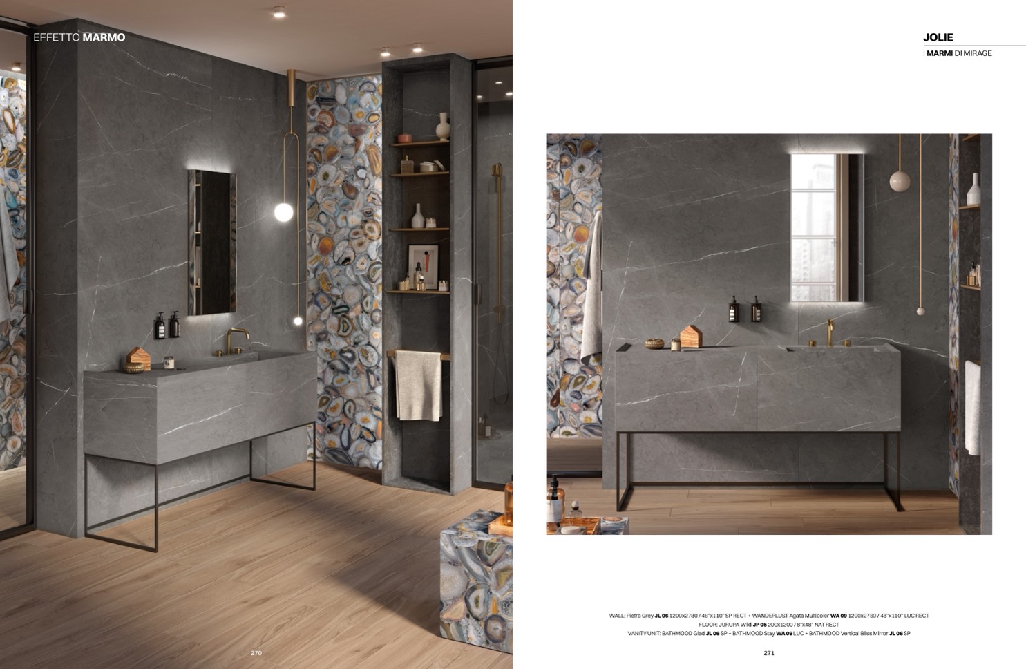 WALL: Pietra Grey JL 06 1200x2780 / 48”x110” SP RECT + WANDERLUST Agata Multicolor WA 09 1200x2780 / 48”x110” LUC RECT
