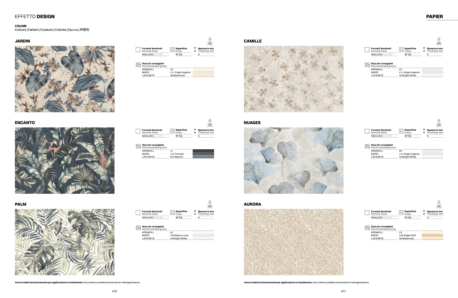 Decori adatti esclusivamente per applicazione a rivestimento. Decorations suitable exclusively for wall applications.