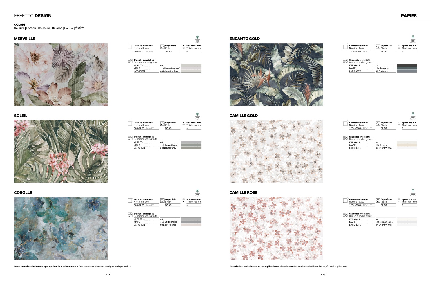 Decori adatti esclusivamente per applicazione a rivestimento. Decorations suitable exclusively for wall applications.