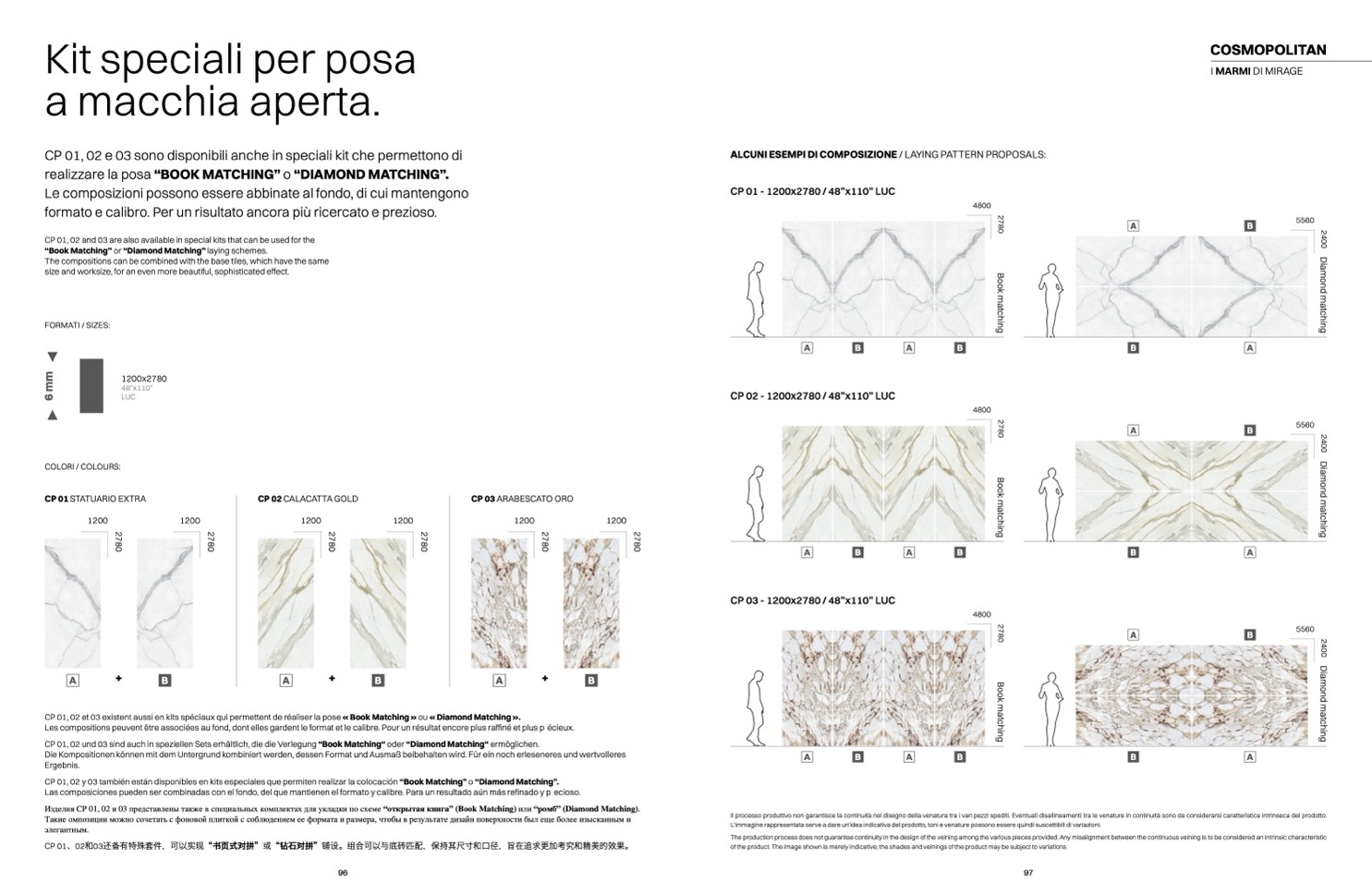 Изделия CP 01, 02 и 03 представлены также в специальных комплектах для укладки по схеме “открытая книга” (Book Matching) или “ромб” (Diamond Matching).