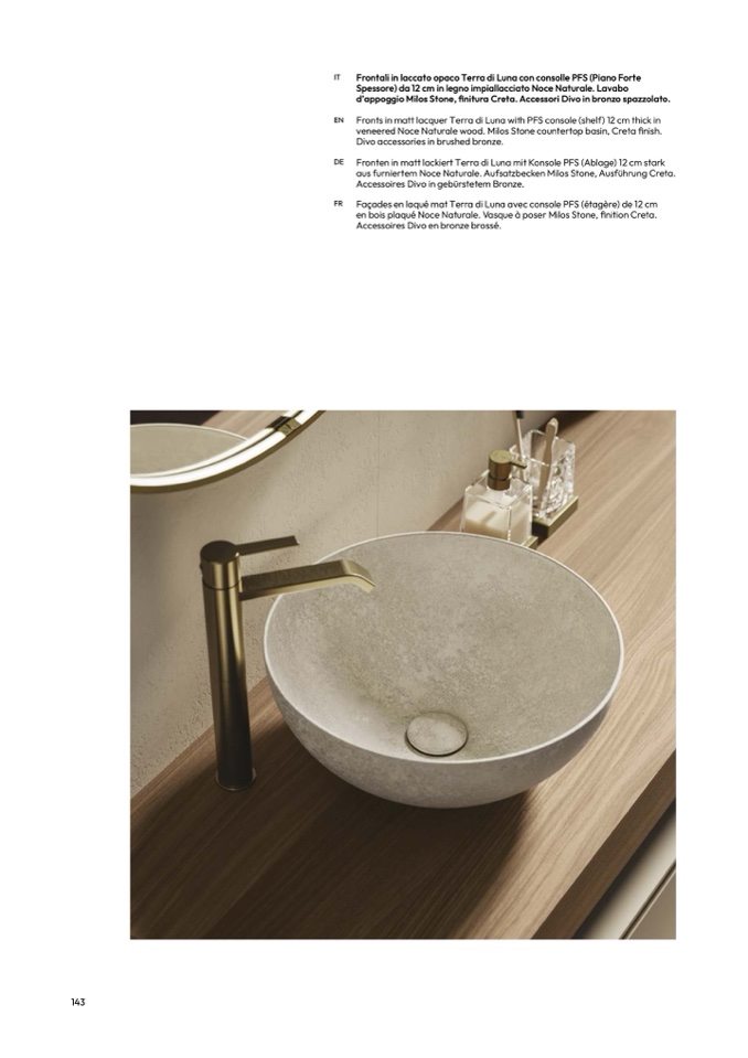 en bois plaqué Noce Naturale. Vasque à poser Milos Stone, finition Creta.
