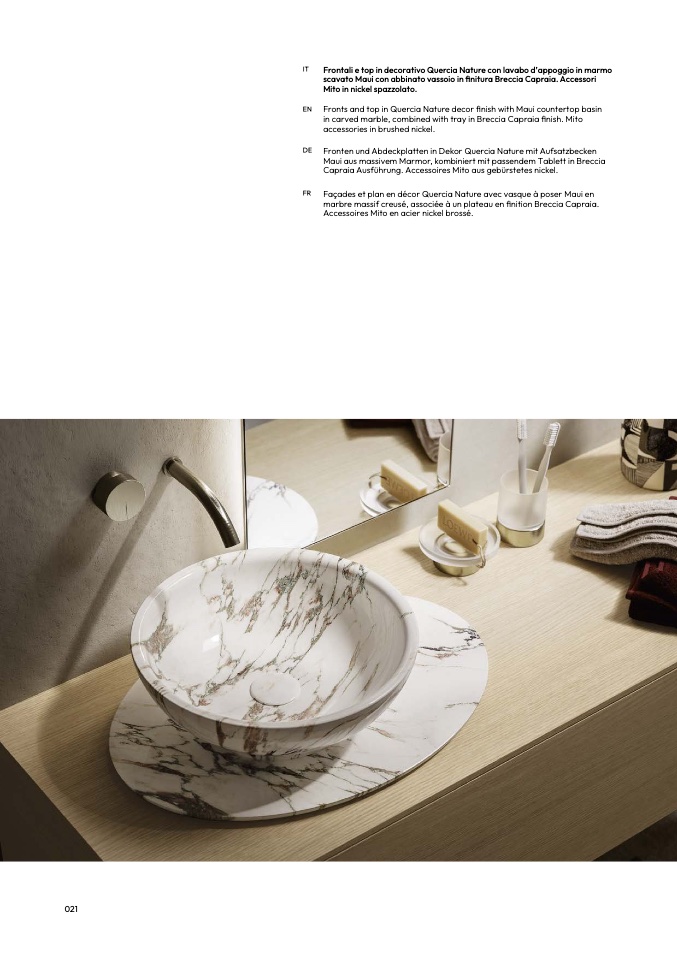 Fronts and top in Quercia Nature decor finish with Maui countertop basin
