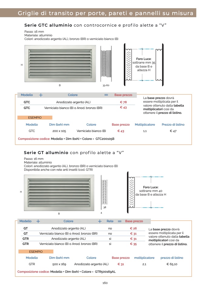 Colori: anodizzato argento (AL), bronzo (BR) o verniciato bianco (B)