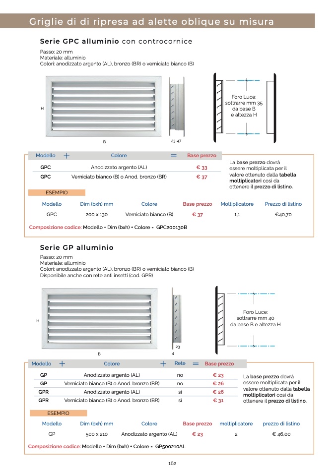 Colori: anodizzato argento (AL), bronzo (BR) o verniciato bianco (B)