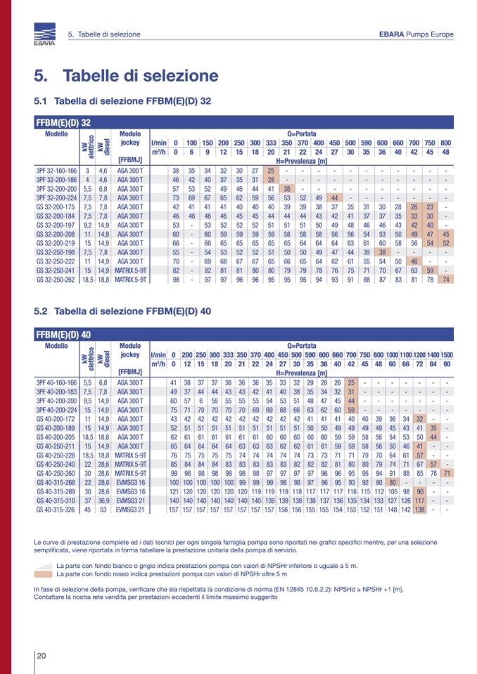 Le curve di prestazione complete ed i dati tecnici per ogni singola famiglia pompa sono riportati nei grafici specifici mentre, per una selezione