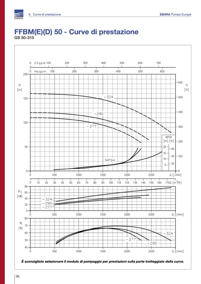 È sconsigliato selezionare il modulo di pompaggio per prestazioni sulla parte tratteggiata della curva.