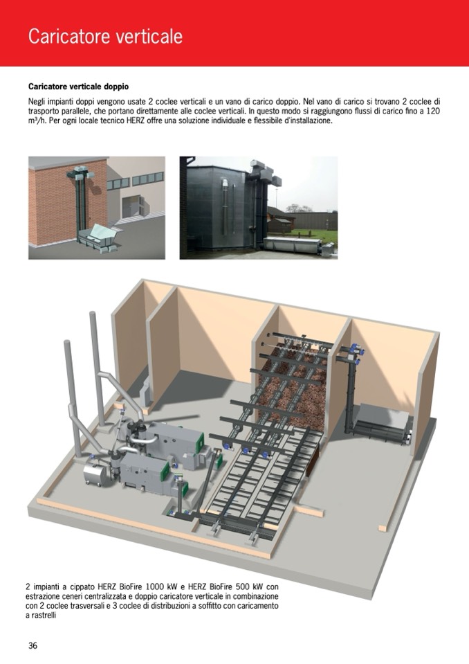 Negli impianti doppi vengono usate 2 coclee verticali e un vano di carico doppio. Nel vano di carico si trovano 2 coclee di
