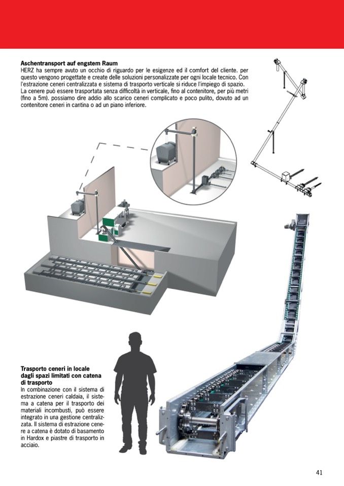 l'estrazione ceneri centralizzata e sistema di trasporto verticale si riduce l'impiego di spazio.