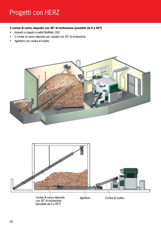 • 2 coclee di carico deposito per cippato con 30° di inclinazione