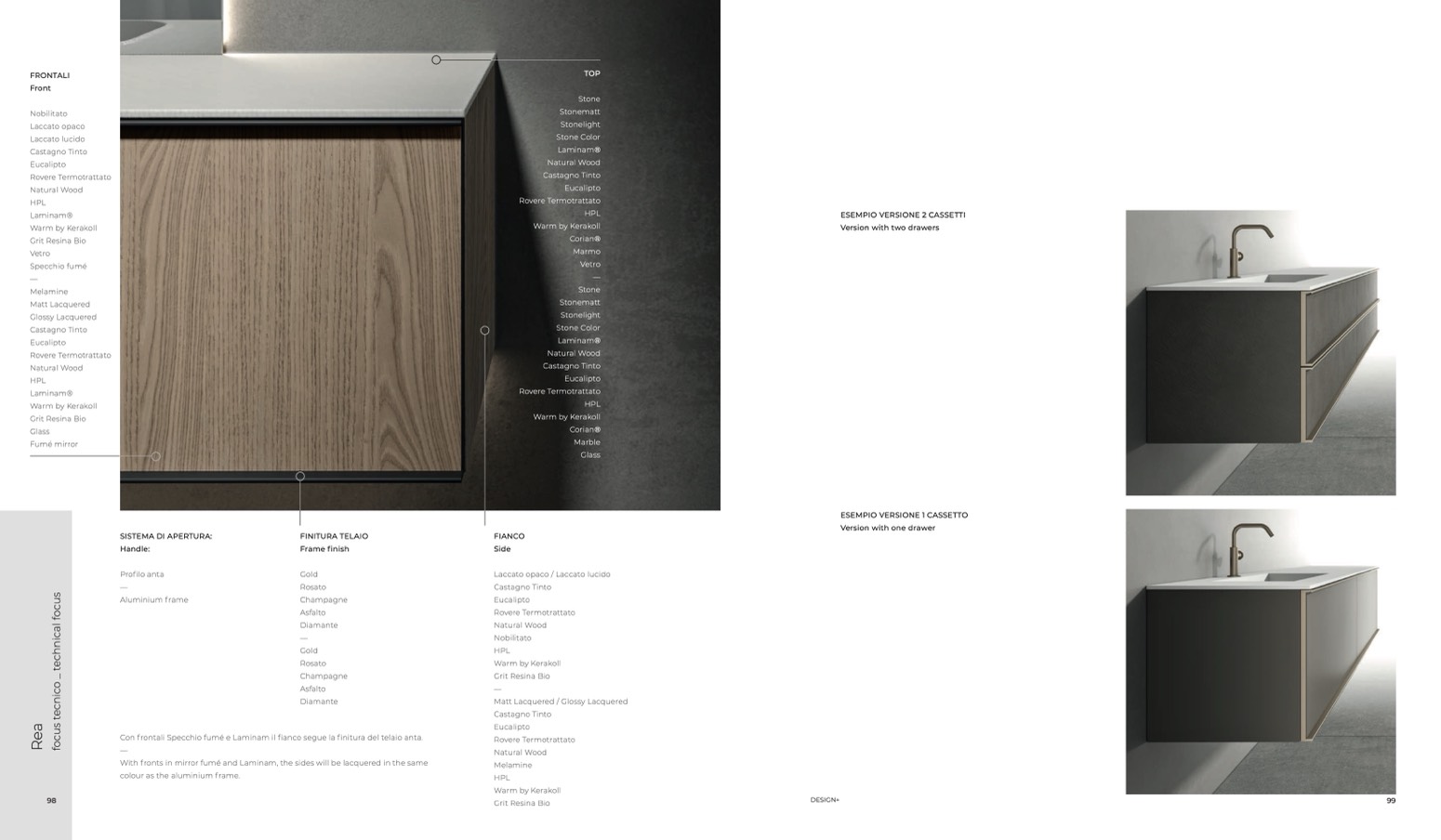 Con frontali Specchio fumé e Laminam il fianco segue la finitura del telaio anta.